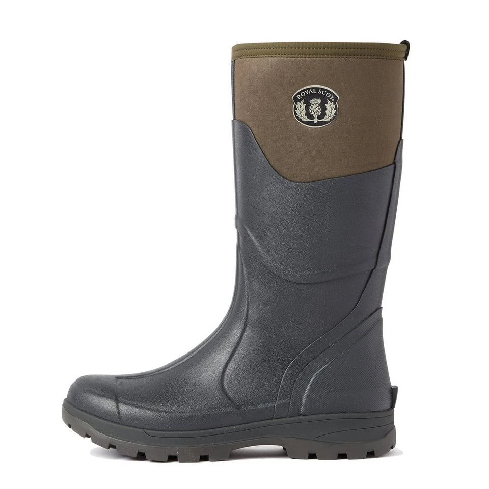 The Men’s Tay Boot from Royal Scot features a neoprene top and lining, forming a true multipurpose shoe which is lighter than traditional full-rubber construction. The material offers an enhanced fit and performance around the calf, while the natural rubber outsole provides secure grip and efficient mud release whether walking or riding. These riding wellington boots are suitable to wear with a variety of legwear options.